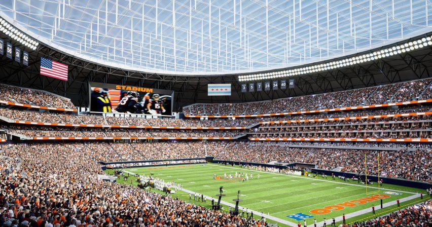استودیو معماری آمریکایی مونیکا (Manica Architecture) و تیم فوتبال آمریکایی شیکاگو بیرز (Chicago Bears) که عضو لیگ ملی فوتبال آمریکا است ، از طراحی یک استادیوم فوتبال در امتداد دریاچه میشیگان در شیکاگو رونمایی کردند که انتقاد محافظه کاران را به دنبال داشت.